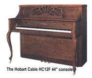 The completely new Hobart M. Cable line includes two studio and two console models. The HC12F is a 44" console featuring French-styled legs in either brown oak satin or cherry satin finish. The HC12M has Mediterranean-style legs in the same selection of finishes. Two 47" studio models are available in either French or Mediterranean styling.
