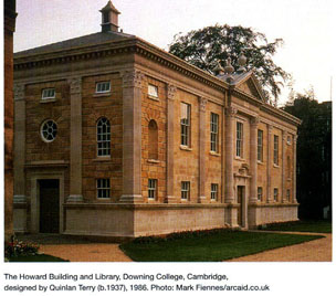 The second unfortunate aspect to Terry's being f6ted as the leader of a new generation of continuing classicists in Britain is that he is, I am sorry to say, a mediocre architect. He goes in for a soft of photocopy-Palladian, with classical details stuck on to dull boxes. Although undoubtedly well made, his architecture is stiff, pedantic and uninspiring. Particularly revealing is the Howard Building at Downing College, Cambridge, a vaguely Palladian design which turns its back on the Greek revival style of the original campus. Ineptitude is demonstrated by the complete failure to integrate--or interpenetrate a lower Doric order with a double height Corinthian, as Cockwell, i.e., for that matter, Palladio knew how to do, while it is simply excruciating to see down-pipes slicing through plinths. And then there are the eight false windows, four of them in symmetrical pairs and so, as balancing elements, redundant. Far from aspiring to a progressive classicism, this is crude, drawing board architecture that undermines efforts to take a modern classicism seriously, yet Quinlan Terry has been consistently praised by the Country Life/Prince of Wales Institute lobby.