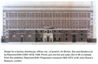 Raymond Erith--some of whose exquisite drawings are currently on display in a centenary exhibition at Sir John Soane's Museum--has long been the most celebrated of those so-called traditionalist architects who carried on building after World War, despite the active opposition of the ascendant modern movement. Many of his projects remained on the drawing board and most of his work consisted of building or altering country houses, but after he reconstructed the interiors of nos. 10, 11 and 12 Downing Street for the Macmillan government interesting jobs came his way, notably the library at Lady Margaret Hall, Oxford. This last, at least externally, is like a large, austere Soanian warehouse, and Soane, indeed, was a hero or mentor for the young Erith. Like others of his generation who intelligently recognised an affinity between the abstraction of Soane and the aesthetic of modernism, Erith considered him 'a very rare bird, and unique among the great architects, in being a progressive classicist'.