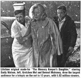 Other standouts included Lifetime's Saturday debut of original telepic "The Memory Keeper's Daughter" (1.6/5, 5.82m), which drew the largest aud for a movie on the net in 13 years. Starring Dermot Mulroney. Gretchen Mol and Emily Watson, pic was the top-rated progain on television Saturday among women 18-49 (2.6/8) and women 25-54 (3.2/9).