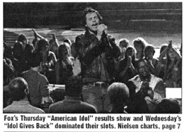 Four hours of "Idol"--including Wednesday's special "Idol Gives Back"--kept Fox perched atop the 18-49 demo scoreboard for a 14th consecutive frame.