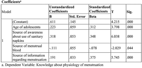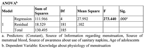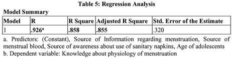Table 5: Regression Analysis Model Summary Model R R Square Adjusted R Square Std. Error of the Estimate 1 .926 (a) .858 .855 .320 (a.) Predictors: (Constant), Source of Information regarding menstruation, Source of menstrual blood, Source of awareness about use of sanitary napkins, Age of adolescents (b.) Dependent variable: Knowledge about physiology of menstruation