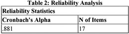 Table 2: Reliability Analysis Reliability Statistics Cronbach's Alpha N of Items .881 17