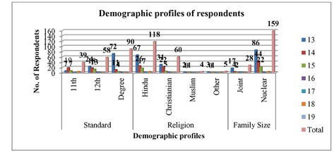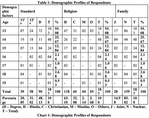 Table 1: Demographic Profiles of Respondents Demographic Standard factors Age 11th 12th D T % 13 07 24 72 103 55.08 14 19 18 11 48 25.67 15 07 13 04 24 12.84 16 - 02 02 04 2.14 17 01 01 - 02 1.06 18 04 - 01 05 2.68 19 01 - - 01 0.53 Total 39 58 90 187 100 Percentage 20.85 31.02 48.13 100 Demographic Religion factors Age H C M O T % 13 67 31 02 03 103 55.08 14 26 22 - - 48 25.67 15 17 05 01 01 24 12.84 16 02 02 - - 04 2.14 17 02 - - - 02 1.06 18 04 - - 01 05 2.68 19 - - 01 - 01 0.53 Total 118 60 04 05 187 100 Percentage 63.10 32.08 2.14 2.68 100 Demographic Family factors Age J N T % 13 17 86 103 55.08 14 04 44 48 25.67 15 02 22 24 12.84 16 02 02 04 2.14 17 02 - 02 1.06 18 01 04 05 2.68 19 - 01 01 0.53 Total 28 159 187 100 Percentage 14.98 85.02 100 (D--Degree, H--Hindu, C--Christianian, M--Muslim, O--Others, J--Joint, N--Nuclear, T--Total)