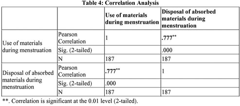 Table 4: Correlation Analysis Use of materials during menstruation Pearson 1 Use of materials Correlation during menstruation Sig. (2-tailed) N 187 Disposal of absorbed Pearson .777 (**) materials during Correlation menstruation Sig. (2-tailed) .000 N 187 Disposal of absorbed materials during menstruation Pearson .777 (**) Use of materials Correlation during menstruation Sig. (2-tailed) .000 N 187 Disposal of absorbed Pearson 1 materials during Correlation menstruation Sig. (2-tailed) N 187 (**). Correlation is significant at the 0.01 level (2-tailed).