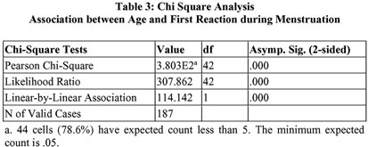 Table 3: Chi Square Analysis Association between Age and First Reaction during Menstruation Chi-Square Tests Value df Asymp. Sig. (2-sided) Pearson Chi-Square 3.803E2 (a) 42 .000 Likelihood Ratio 307.862 42 .000 Linear-by-Linear Association 114.142 1 .000 N of Valid Cases 187 (a.) 44 cells (78.6%) have expected count less than 5. The minimum expected count is .05.
