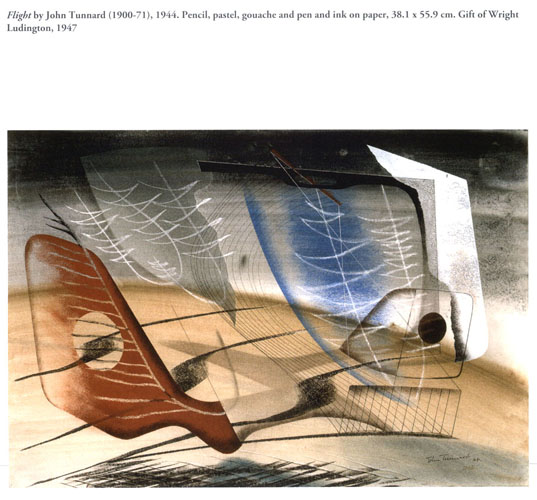 Flight by John Tunnard (1900-71), 1944. Pencil, pastel, gouache and pen and ink on paper, 38.1 x 55.9 cm. Gift of Wright Ludington, 1947