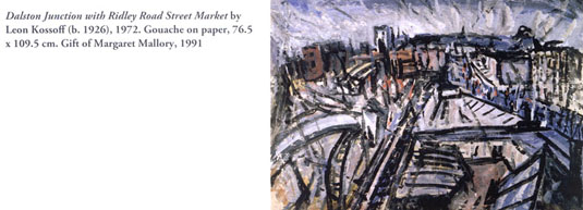 Dalston Junction with Ridley Road Street Market by Leon Kossoff (b. 1926), 1972. Gouache on paper, 76.5 x 109.5 cm. Gift of Margaret Mallory, 1991