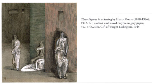 Three Figures in a Setting by Henry Moore (1898-1986), 1942. Pen and ink and waxed crayon on grey paper, 45.7 x 43.2 cm. Gift of Wright Ludington, 1945