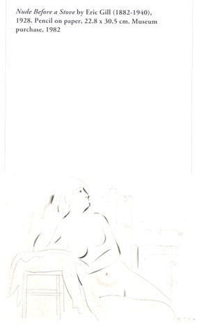 A sculptor, letter-cutter, printmaker, draughtsman, architect, typeface-designer and polemicist, Eric Gill was divided between his commitment to Roman Catholicism and his obsession with both the richness and variety of sex. As a draughtsman he developed a fine, clear and incisive line, using the minimum of shading--a technique not dissimilar to that employed in his wood-engravings, but to the opposite effect. His drawings are dark pencil line on white paper, while the engravings are white outline against black. Nude Before a Stove is unusual in that Gill has defined a complete context for the nude rather than just making a figure study.