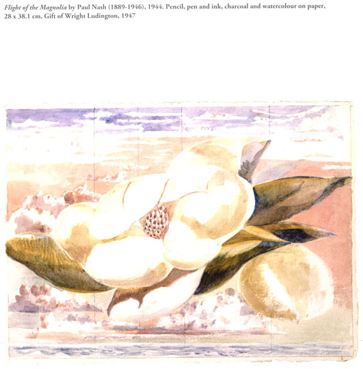 In 1940 Nash was attached to the Air Ministry as an official war artist but because of his acute asthma, a legacy from his time in the trenches during World War I, he was not permitted to fly. Despite lack of first-hand experience, he allowed his imagination to take wing, with surprising results. Over the next two years he produced not only such masterpieces as Battle of Britain and Battle of Germany (both Imperial War Museum, London) but also a series of watercolours of anthropomorphic bombers--'aerial creatures' as he called them. This stimulated a further series of dream-related images and he wrote to a friend saying he was 'doing some strange new pictures. Giant flowers blooming among the clouds or sailing down the night skies like falling stars.' Flight of the Magnolia is one of the most exuberant examples from this group.