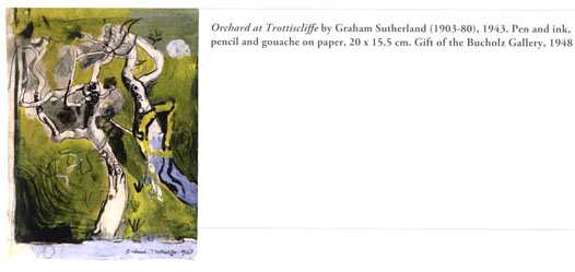 Orchard at Trottiscliffe by Graham Sutherland (1903-80), 1943. Pen and ink, pencil and gouache on paper, 20 x 15.5 cm. Gift of the Bucholz Gallery, 1948